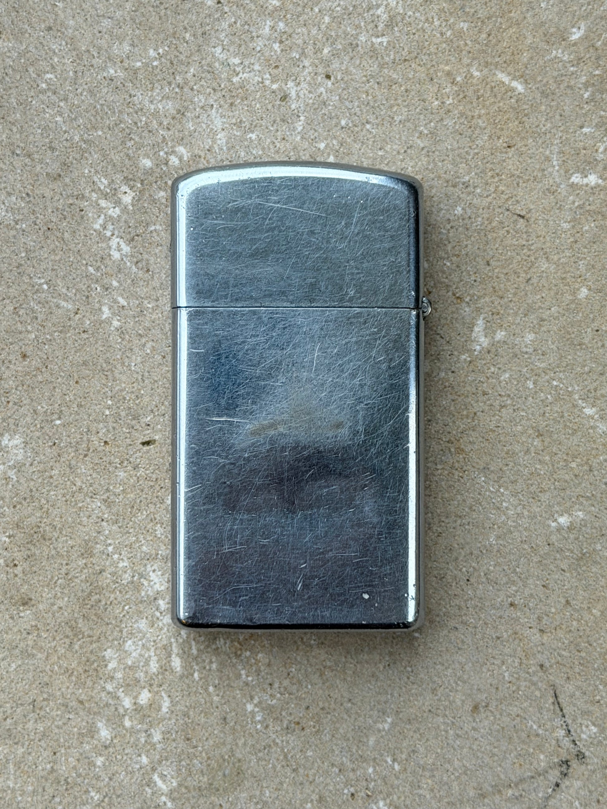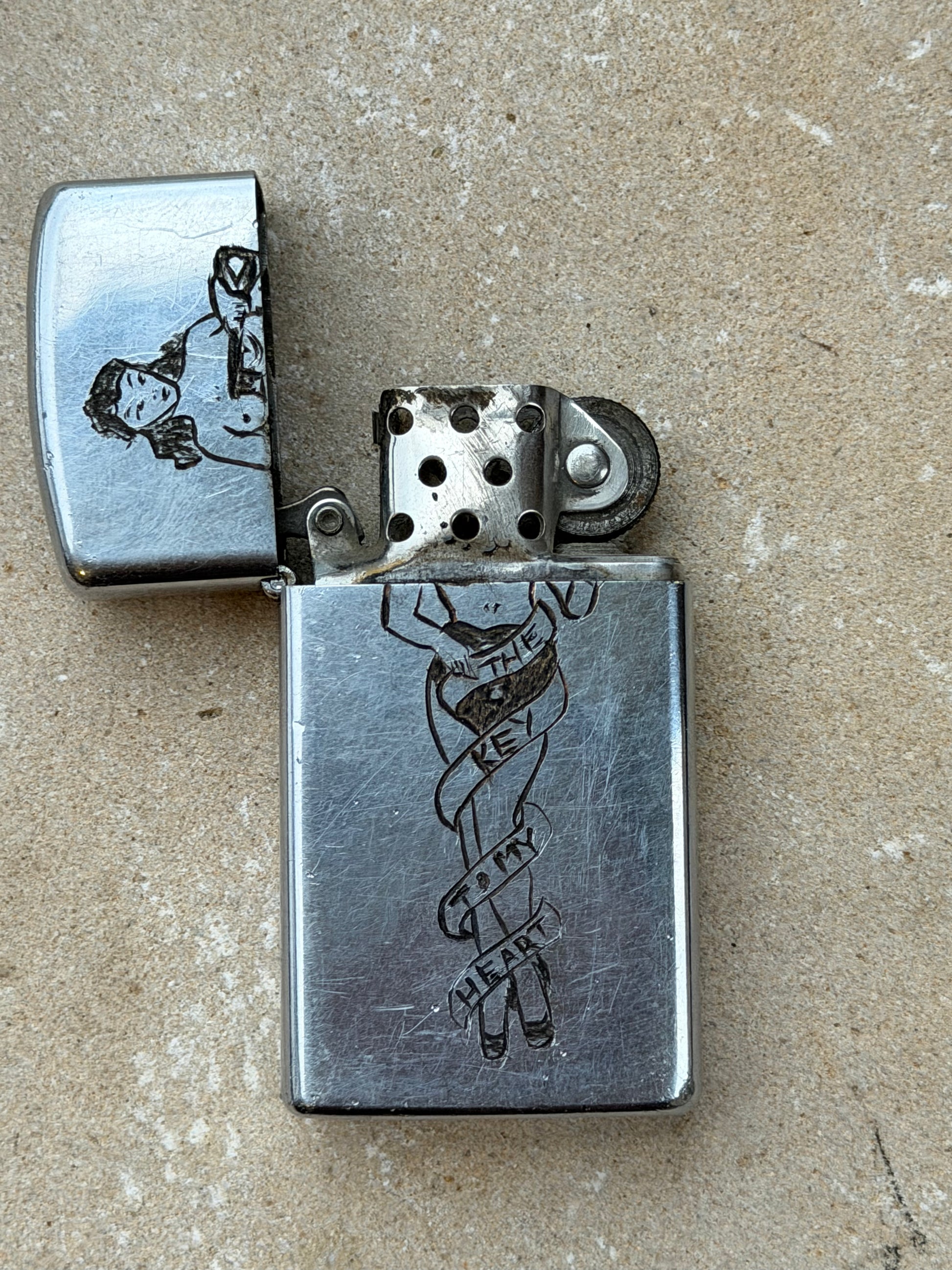 Authentic 1963 Zippo lighter with hand-engraved artwork. Vintage case shows original patina and wear. One of a kind.