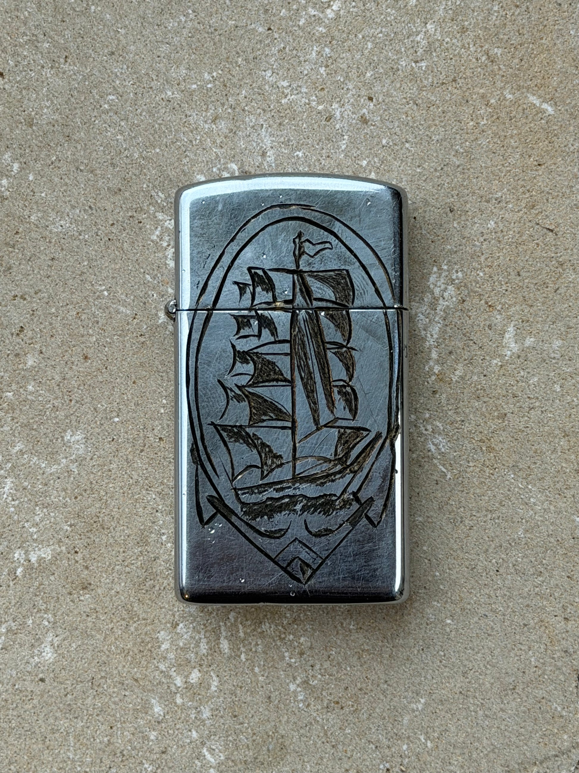 Authentic 1952 Zippo lighter with hand-engraved artwork. Vintage case shows original patina and wear. Working Condition. One of a kind.
